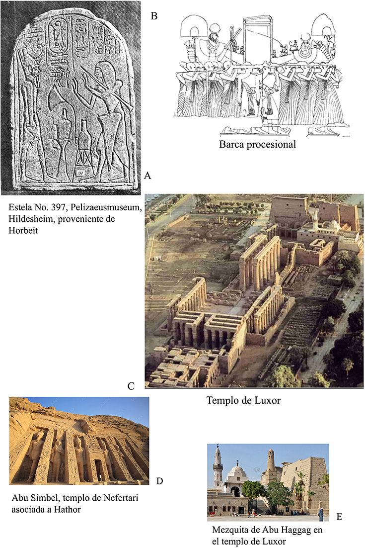 En el programa de construcción de templos, Ramsés II amplió el de Luxor [25], que tenía un significado especial: era el templo de la consagración de la realeza. En la celebración de la Fiesta Opet, luego de la coronación en Karnak, las barcas sagradas de la tríada tebana, Amón, Mut y Khonsw, visitaban el templo como renovación del ciclo de la realeza, momento en que el nuevo rey recibía el ka real de sus antepasados por lo que se legitimizaba su derecho al trono (Fig. 4, C). El significado político-religioso del templo de Luxor se mantuvo a lo largo del tiempo, como lo indica el hecho que Alejandro, cuando conquistó Egipto, construyó una capilla allí y no en Karnak, y que fue el centro del culto al emperador durante el dominio romano.
