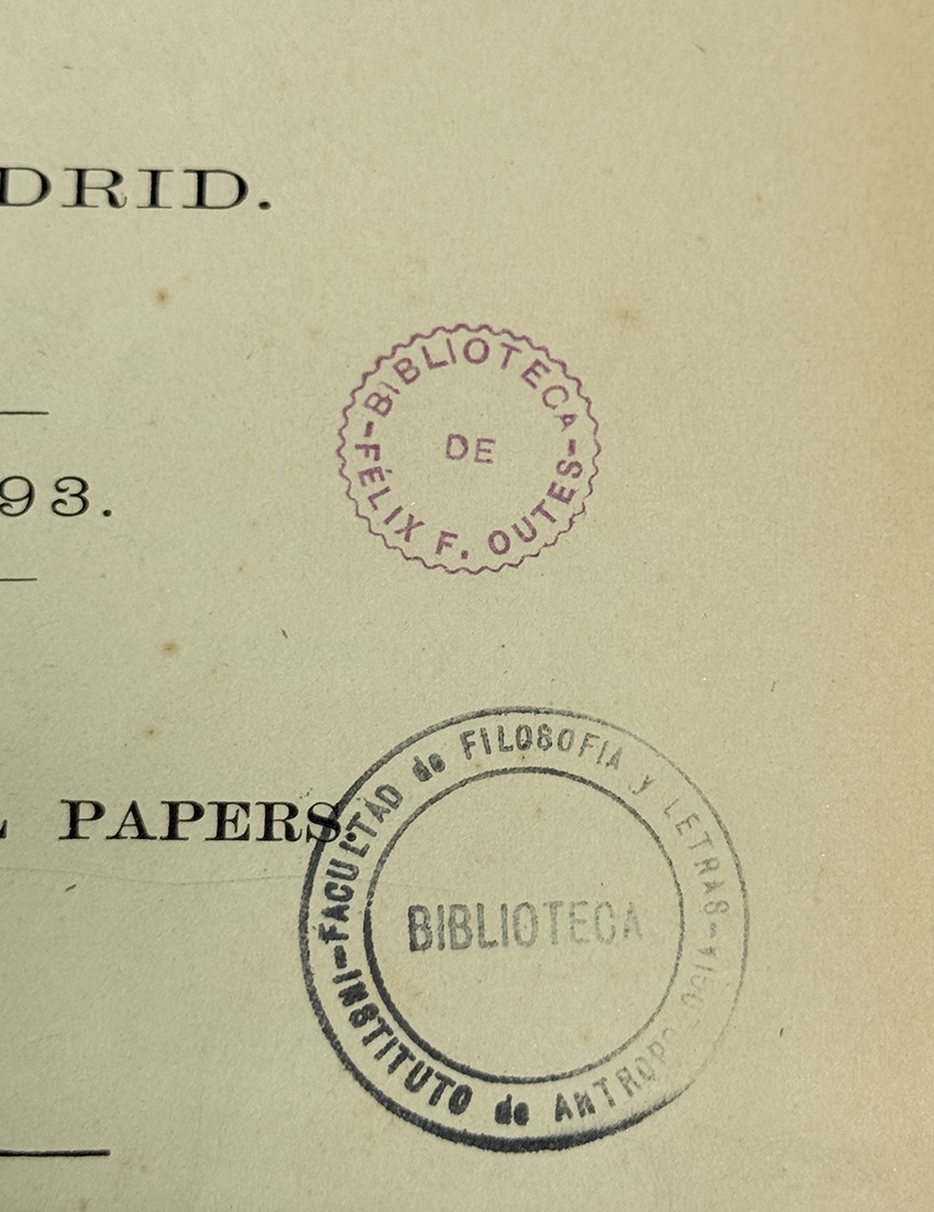Detalle de una portada con el ex libris de Félix F. Outes, y el correspondiente a la Biblioteca de la Facultad de Filosofía y Letras - Instituto de Antropología.
