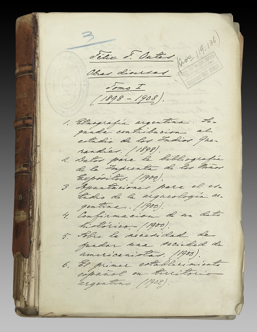 Índice manuscrito con «Obras diversas» de Félix F. Outes. Ejemplares conservados en la Biblioteca del Museo Etnográfico.