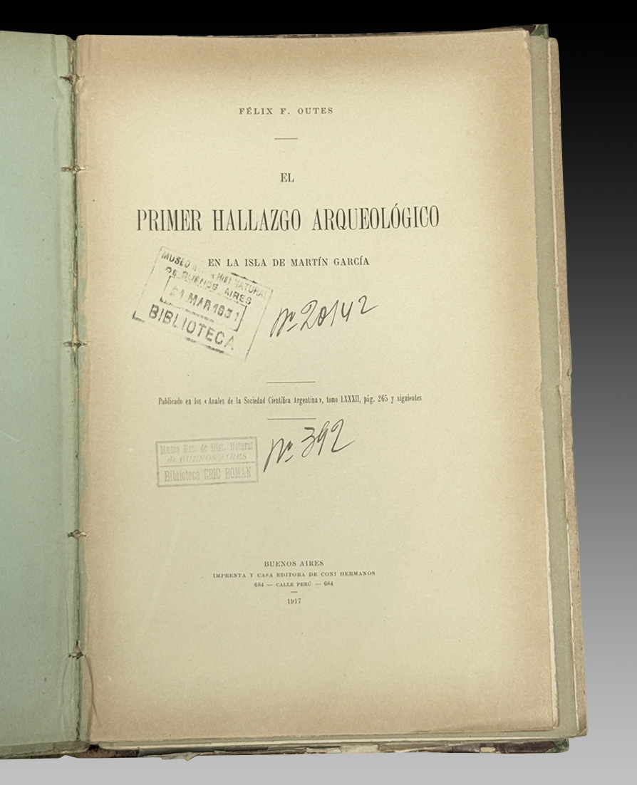 El primer hallazgo arqueológico en la Isla de Martín García. Por Félix F. Outes. Publicado en los Anales de la Sociedad Científica Argentina, 1917.