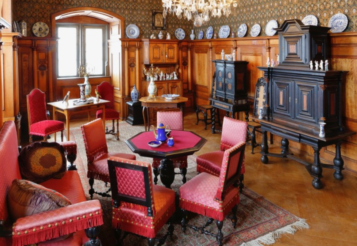 En el museo predomina una atmósfera de «residencia histórica» auténtica. La exposición ha sido diseñada como un «escenario vivo» donde parece que los residentes acaban de salir de la habitación. El mobiliario original del castillo, que data en parte del Renacimiento, integrando el arte plástico con la vida cotidiana aristocrática, complementa la atmósfera de las 30 salas de exhibición, con armarios renacentistas tallados, cofres góticos y mesas de estilo barroco y rococó, majestuosas estufas de cerámica que formaban parte del confort y la decoración de las salas principales, así como una selección de copas de cristal y objetos de plata de alta calidad que muestran la sofisticación de la mesa noble. La colección textil y relativa a la moda exhibe vestidos de gala originales y accesorios de la familia que datan de finales del siglo XIX y piezas curiosas como un «vestido de emergencia» confeccionado con tela de paracaídas tras la Segunda Guerra Mundial y el uniforme de gala de embajador de Karl Luxburg. Y no falta la colección de abanicos chinos.