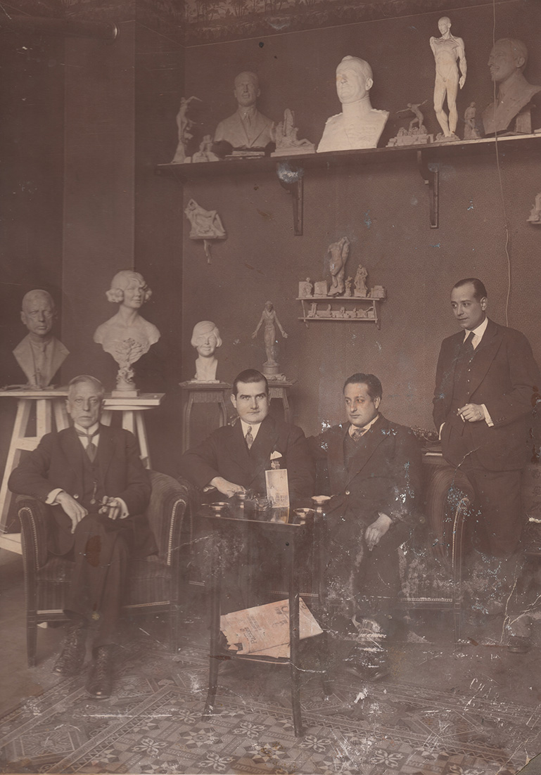 Reunión en el taller del artista en París, 1929. Entre los sentados, a la derecha, Enrique de Prat Gay. Fotografía: Gentileza familia de Prat Gay.