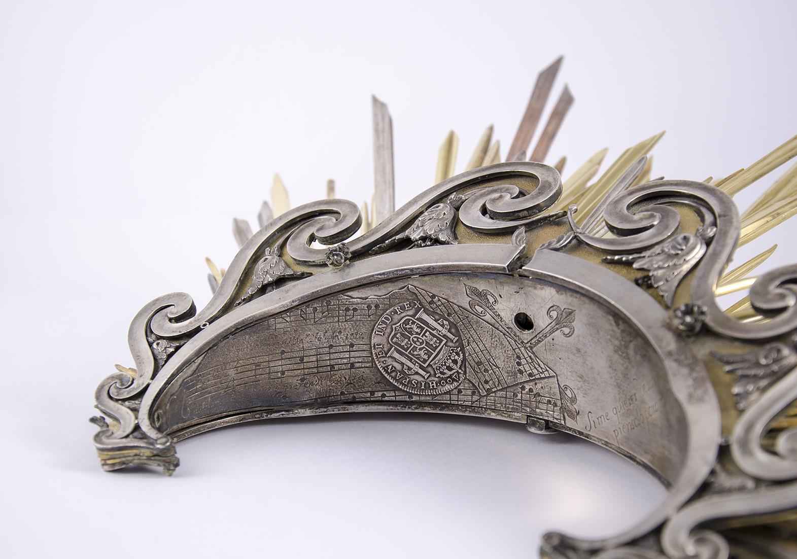 Detalle del arco interior de la aureola realizada por José Boqui en 1799, con una de las leyendas buriladas. Colección Schenone. Fotografía: Nicolás Vega.