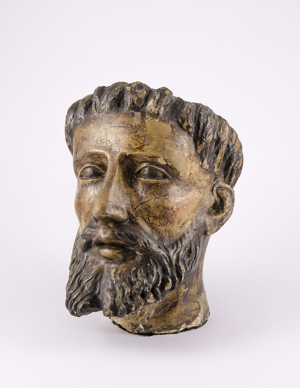 Cabeza de imagen de vestir. Yeso, maguey y madera policromada. En tamaño natural. Siglo XVIII. Colección Schenone. Fotografía: Nicolás Vega.