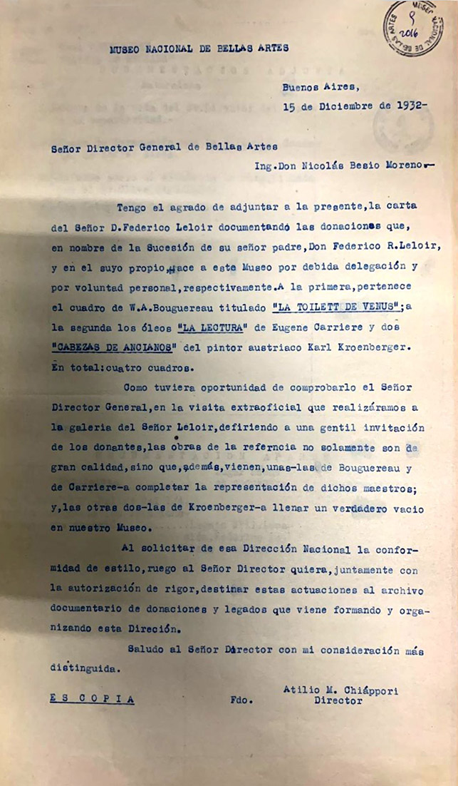 Agradecimientos: al arquitecto Andrés Duprat, director del Museo Nacional de Bellas Artes, por facilitar la carta que alude a la donación de Leloir, y a Astrid Maulhardt por hacer la primera identificación de las obras.