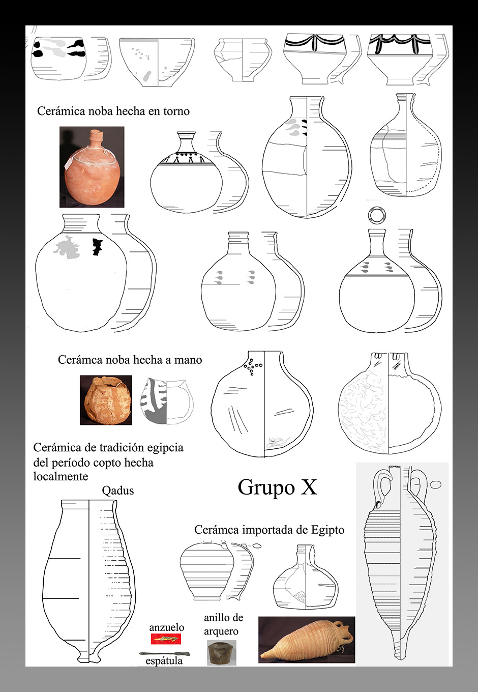 Convergen en la cerámica del «Grupo X» tres tradiciones culturales: la cerámica noba hecha en torno [treinta y ocho vasijas] y cinco hechas a mano, ambas con variantes dentro de cada estilo, y dos piezas de cerámica de tradición egipcia del período copto hechas localmente. La existencia de estas tres tradiciones refleja las diferentes influencias culturales que han recibido, la primera de la cultura meroítica sobre la que se asentó; la segunda de su zona de origen, Kordofan, y la tercera está representada sólo por el qadus, una forma que se repite en el tiempo, es el recipiente que se colocaba en la sarqiya o noria para recoger el agua e irrigar los huertos. La sarqiya aparece en Egipto a partir del siglo III a.C. y se sigue usando en la actualidad en toda la región.