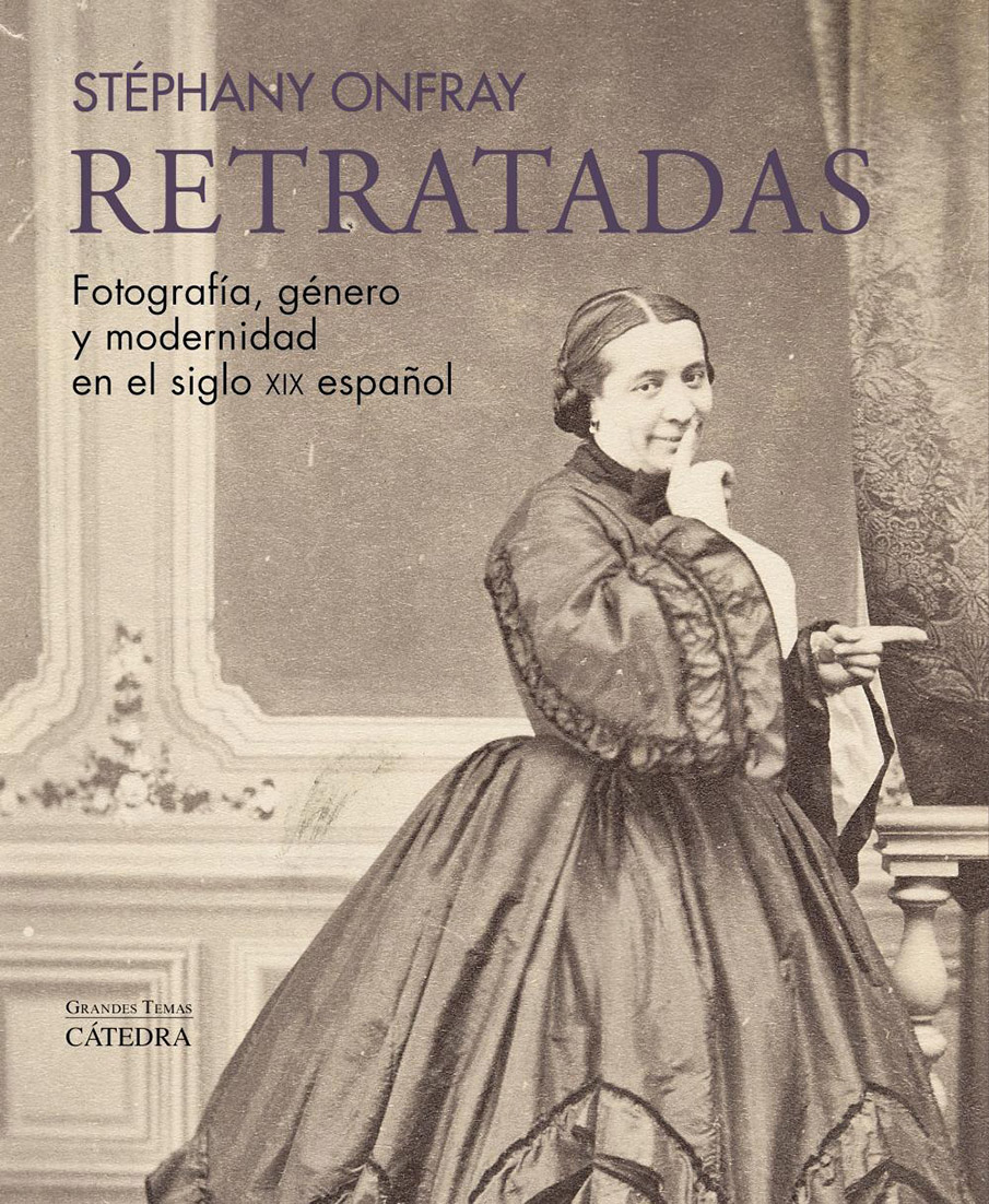 Intenté plasmar esta idea en la portada de mi libro Retratadas. Fotografía, gérnero y modernidad en el siglo XIX españo [Cátedra, 2025], donde desarrollo el aparato teórico que sostiene la exposición y que, a su vez, funciona como catálogo de la misma. En ella, una mujer rompe la cuarta pared —simbolizada por la cámara y el fotógrafo— y se dirige al espectador, a quien convierte en cómplice del engaño.