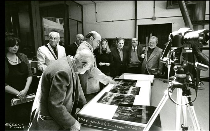 En primer plano, observando las imágenes, Héctor Schenone. En TAREA, con el equipo de trabajo. 2006. Fotografía: Aldo Sessa.
