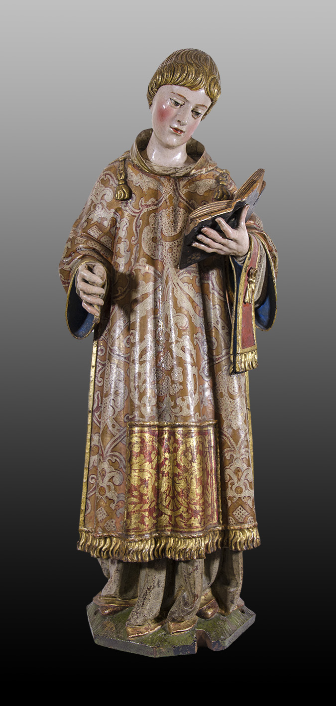 San Lorenzo. Madera dura tallada, policromada y estofada, 95 cm. Palencia (?), España. Segundo cuarto del siglo XVI. Obra adquirida en 1947, en su viaje a España. Colección Héctor Schenone. Fotografía: Nicolás Vega.
