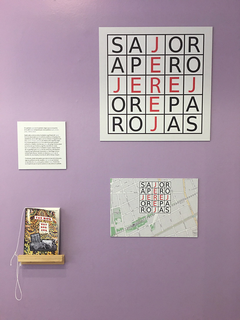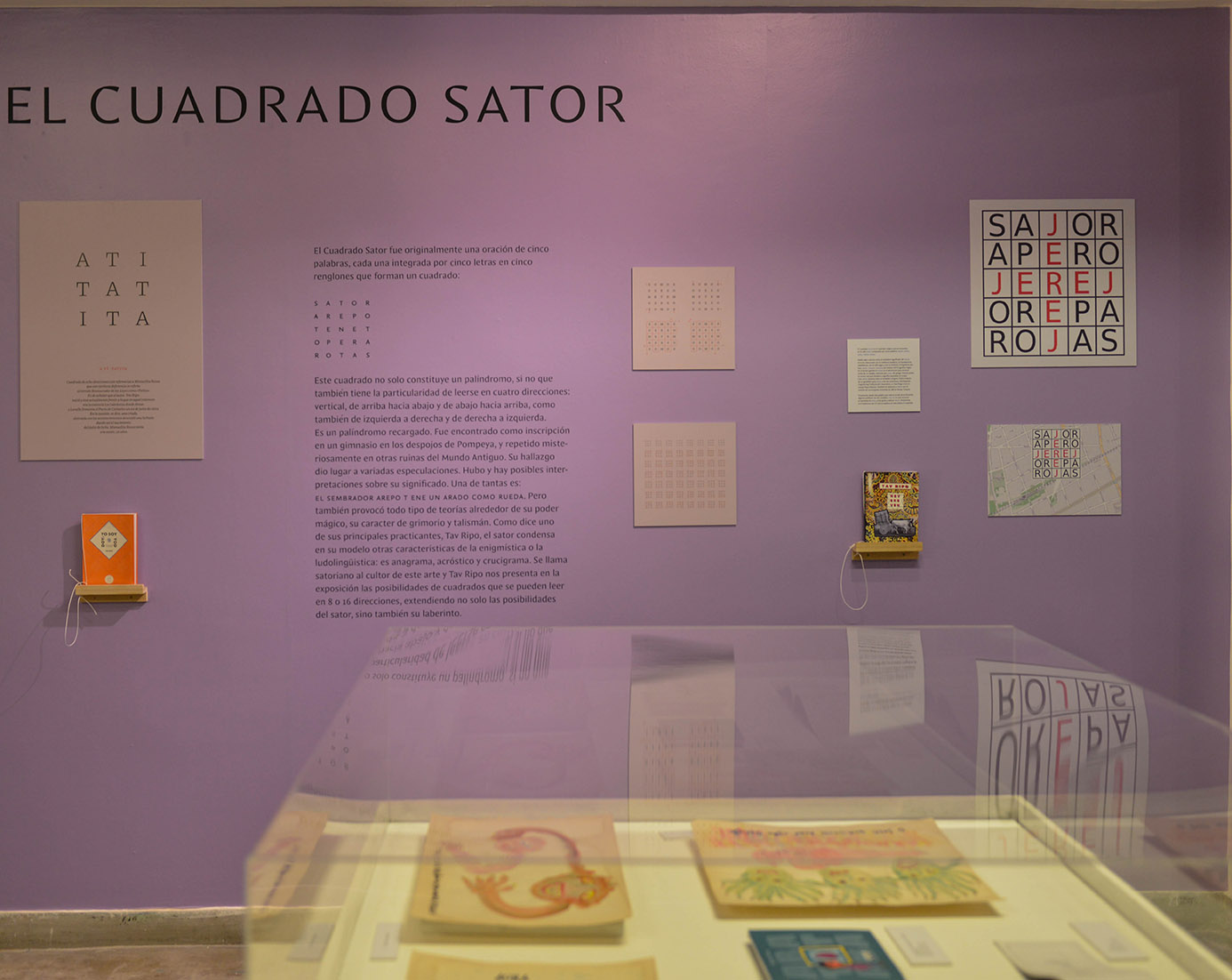 Fue originalmente una oración de cinco palabras, cada una integrada por cinco letras en cinco renglones que forman un cuadrado. Este cuadrado no solo constituye un palíndromo, sino que también tiene la particularidad de leerse en cuatro direcciones: vertical, de arriba hacia abajo y de abajo hacia arriba como también horizontal: de izquierda a derecha y de derecha a izquierda. Las palabras que lo componen son: SATOR AREPO TENET OPERA ROTAS. Digamos que es un palíndromo recargado. Fue encontrado como inscripción en un gimnasio en los despojos de Pompeya, y repetido misteriosamente en otras ruinas del Mundo Antiguo. Su hallazgo dio lugar a variadas especulaciones. Hubo y hay posibles interpretaciones sobre su significado. Una de tantas es: EL SEMBRADOR AREPO TIENE UN ARADO COMO RUEDA. Pero también provocó todo tipo de teorías alrededor de su poder mágico, su carácter de grimorio [1] y talismán. Como dice uno de sus principales practicantes, Tav Ripo, el sator condensa en su modelo otras características de la enigmística o la ludolingüística: es anagrama, acróstico y crucigrama. Se llama satoriano al cultor de este arte y Tav Ripo nos presenta en la exposición las posibilidades de cuadrados que se pueden leer en 8 o 16 direcciones extendiendo no solo las posibilidades del sator, sino también su laberinto.