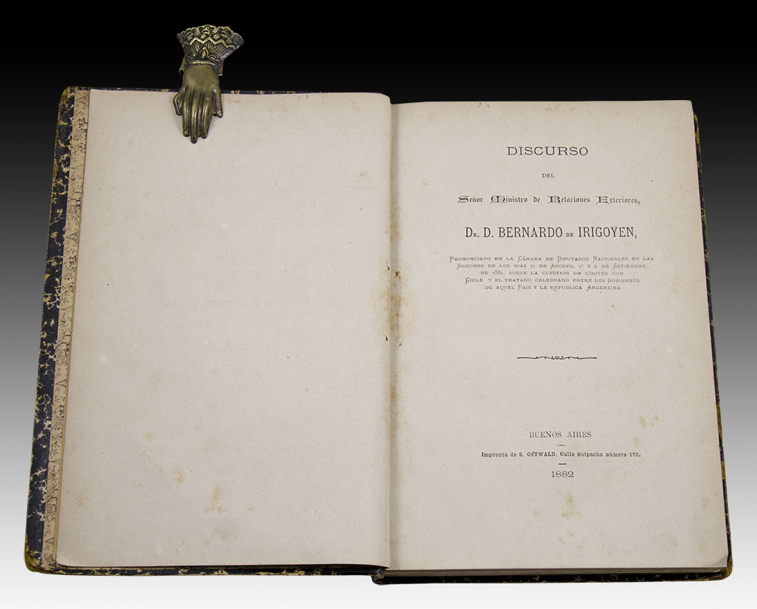 Discurso del Señor Ministro de Relaciones Exteriores, Dr. D. (...) Pronunciado en la Cámara de Diputados Nacionales de las Sesiones de los dias 31 de Agosto, 1° y 2 de Setiembre de 1881, sobre la cuestión de límites con Chile y el Tratado celebrado entre los Gobiernos de aquel país y la República Argentina. Buenos Aires. Imprenta de S. Ostwald. 1882.