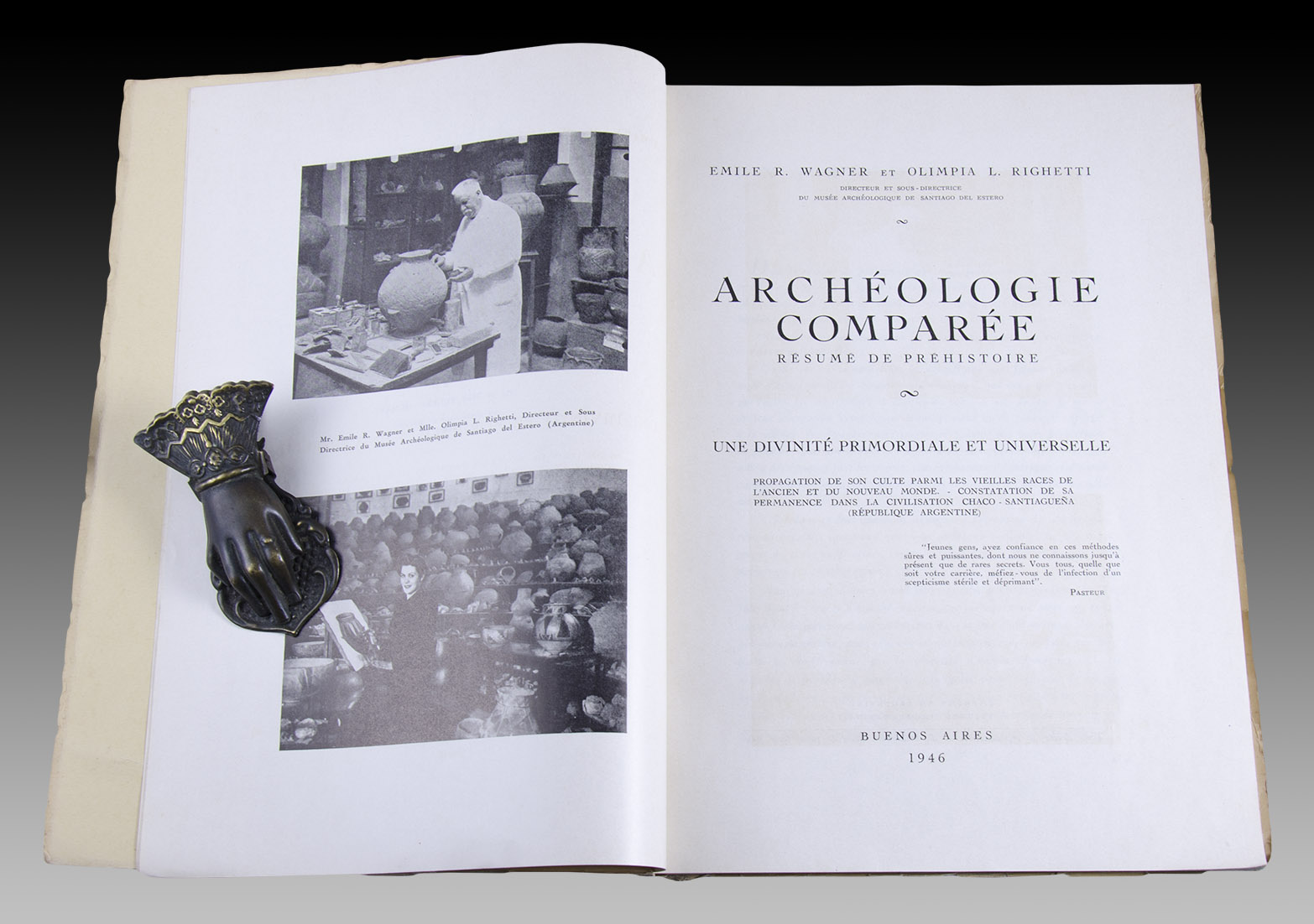 El señor Emile Roger Wagner (Ormiston, Escocia, 1868 - Santiago del Estero, 1949) y la señorita Olimpia L. Righetti fueron director y subdirector, respectivamente, del Museo Arqueológico de Santiago del Estero. Emile Wagner junto a su hermano Duncan propusieron la hipótesis, hacia la década de 1930, de la existencia de una civilización Chaco - Santiagueña, apoyándose en los descubrimientos arqueológicos realizados en Santiago del Estero hacia comienzos del siglo. Las preciosas láminas a colores llevan la firma de Duncal Wagner.