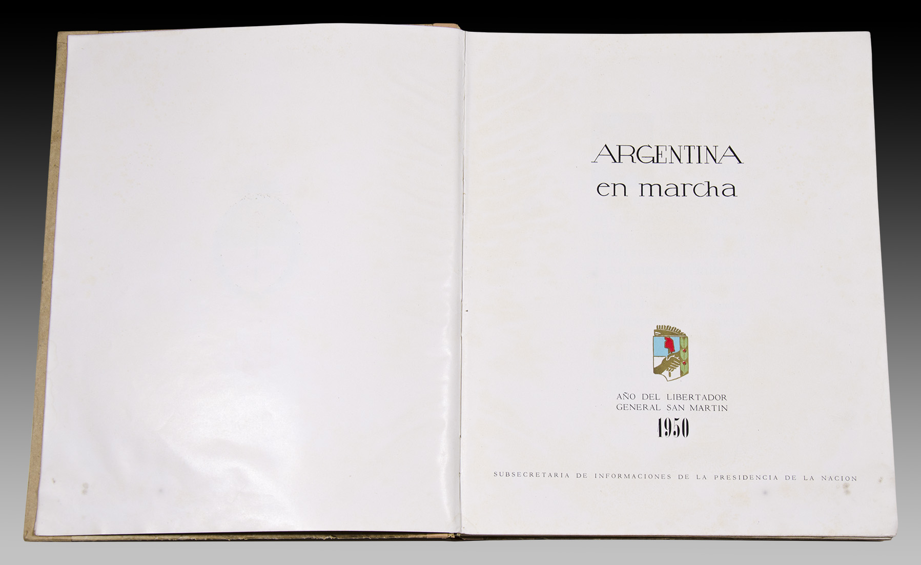 El año 1950 se caracterizó por la consolidación del gobierno de Juan Domingo Perón y la jerarquización de la figura patriótica del General José de San Martín cuando se recordaba el centenario de su fallecimiento en Francia. (Ver lote 57) El Álbum “La Argentina en marcha” recoge la dinámica labor gubernamental en la mayoría de los campos de la producción y señala el privilegio que el gobierno nacional le asigna a las tareas sociales y culturales.