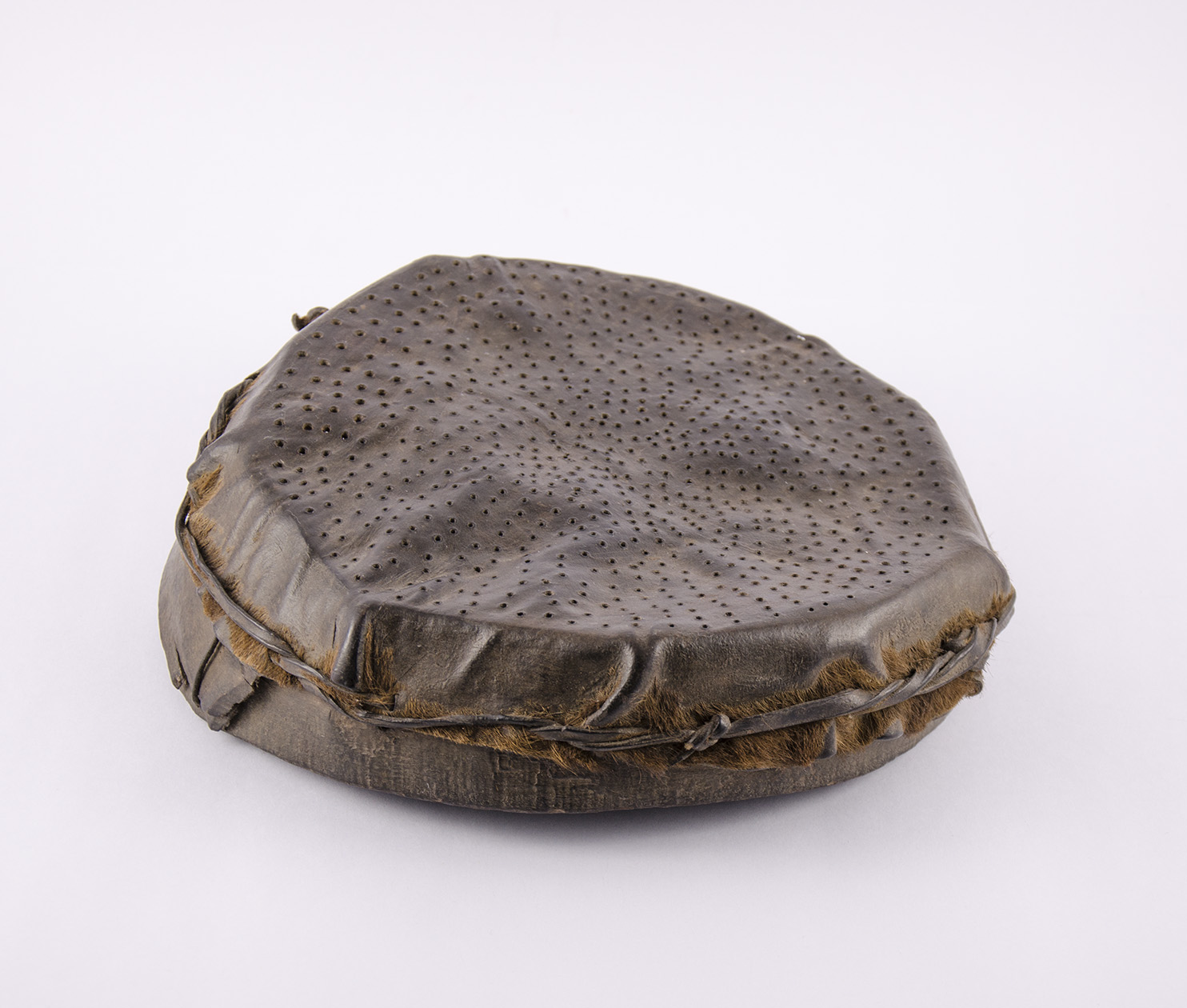 Utensilio de interés etnográfico, difícil de localizar. De forma circular y plana, fue construido con un cuero vacuno, pelado y perforado, el que envuelve un aro de madera que le da forma desde su interior. Ambos elementos están sujetados por una tira de cuero que los atraviesa a lo largo de toda la circunferencia.