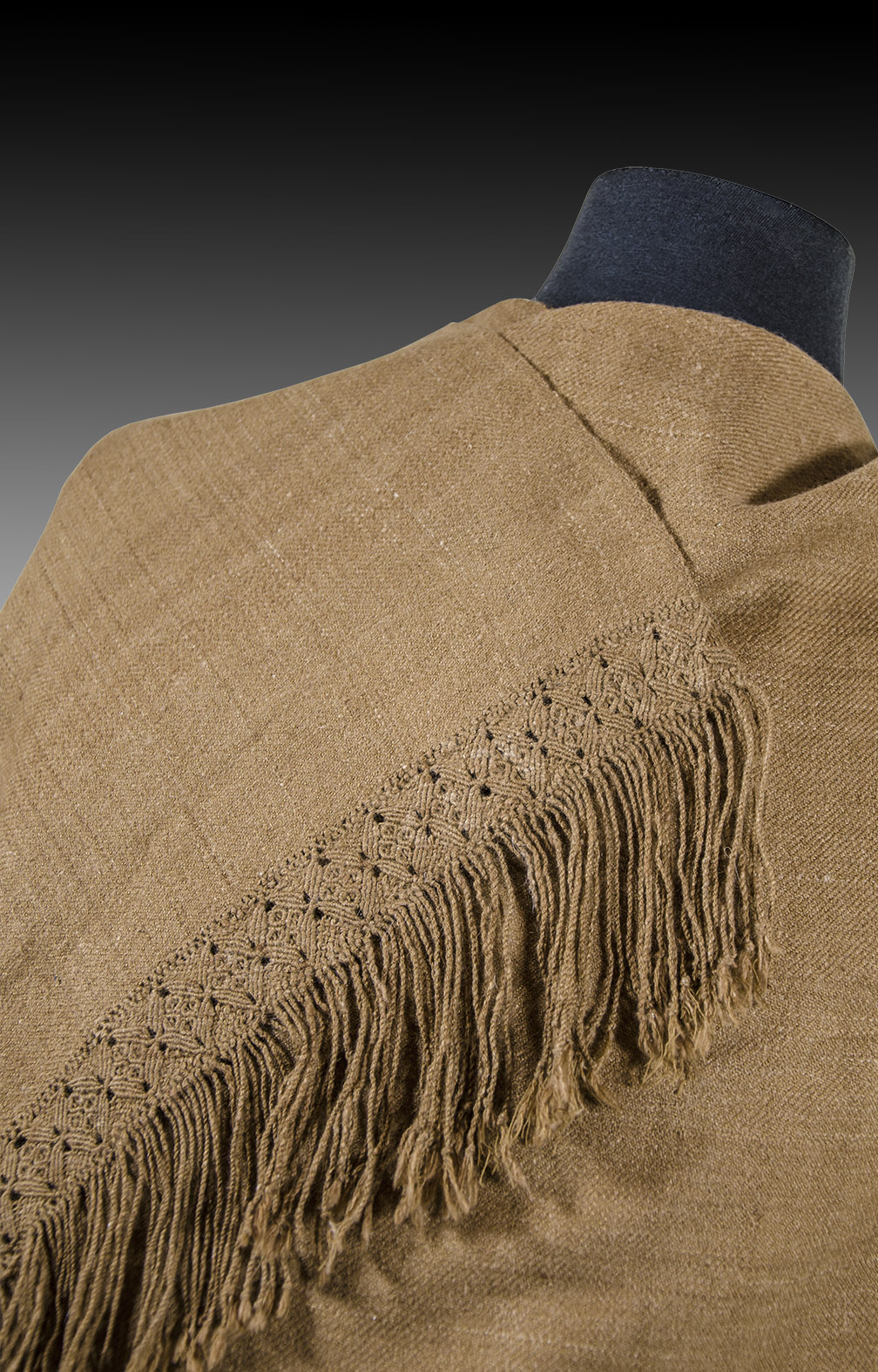 Muy interesante prenda tejida en telar de cintura, con técnica de faz de urdimbre, con fibras de vicuña (del dorso del animal) en la trama y urdimbre, hilada en forma manual con huso. Acorde a la tradición textil del altiplano que hermana geográficamente al Alto Perú (hoy Bolivia) con las provincias del noroeste argentino, la concepción ornamental de esta prenda guarda estricta correlación cronológica con la época en que fue tejida -hace ya un siglo-: tejido llano con punto de sarga, (el punto o técnica de sarga estaba destinado a las piezas textiles de alta calidad), rematado en sus bordes con un muy elaborado rapacejo -en una clara influencia criolla- de diseño floral que culmina en flecos estructurales retorcidos. Medidas. Largo: 170 cm. Ancho: 60 cm.