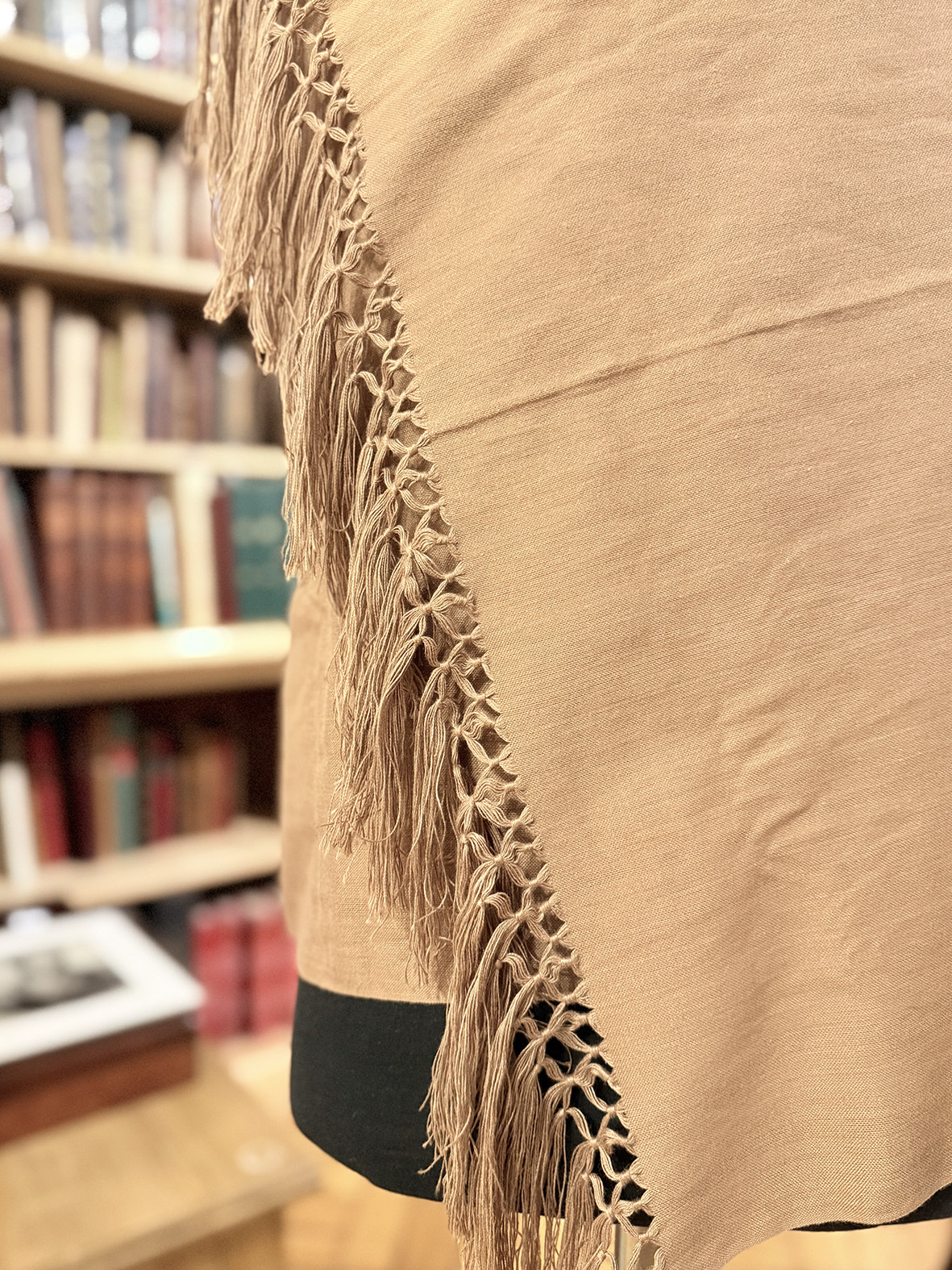Prenda de excelente calidad, tejida con urdimbre de vicuña y trama de seda, decorada en sus extremos con rapacejo y fleco.