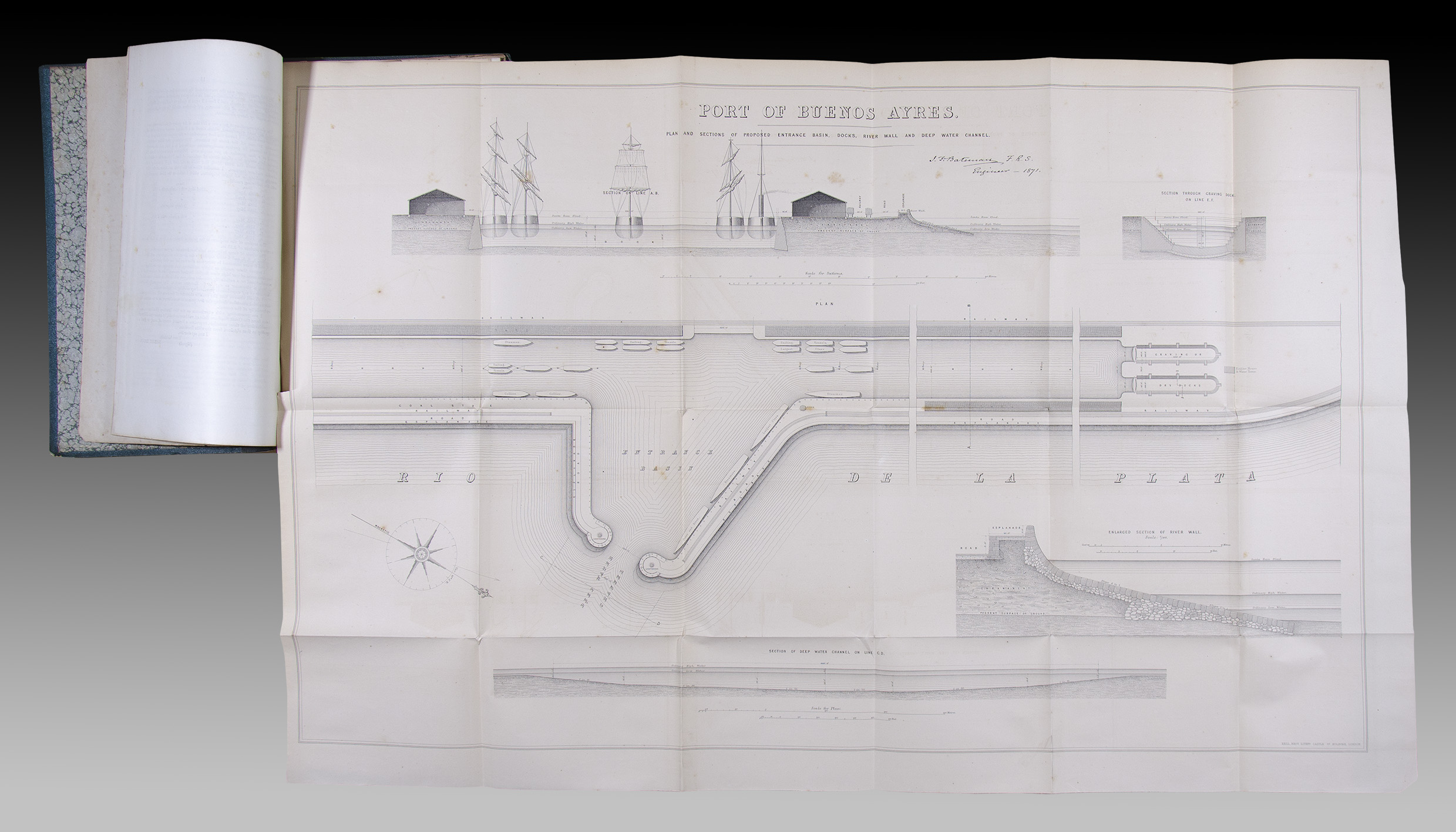 14 pp. + un plano y una planilla plegados. Otro Report sobre el Puerto de Buenos Aires (1871) con 28 pp + plano y tablas. Con un Informe final de Reid a su regreso a Inglaterra con 14 pp + plano y tabla. Este segundo ejemplar de los tres impresos está Encuadernado.