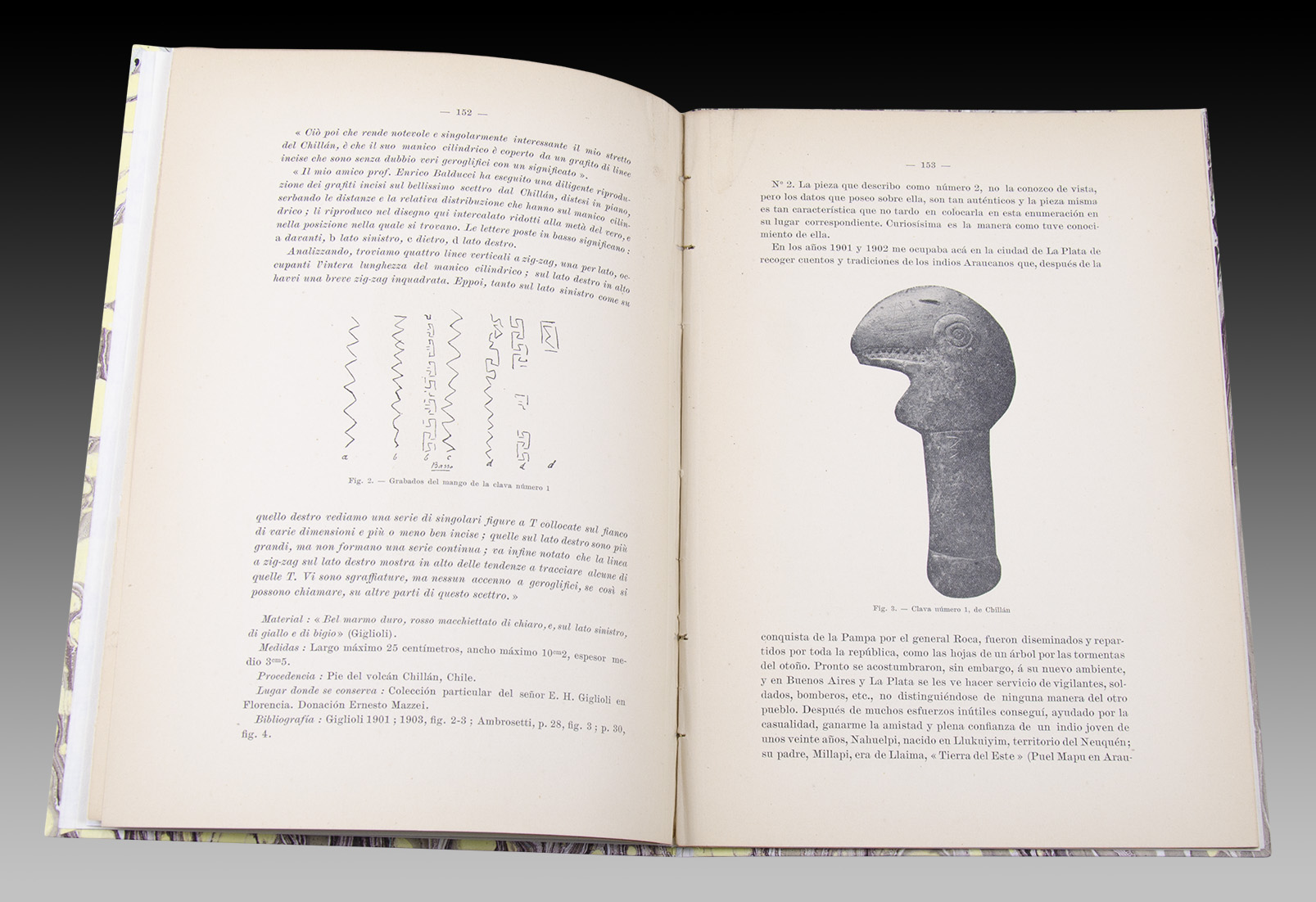 En la presente monografía -publicada en la revista del Museo de La Plata, vol. 16, de 1909- se ocupa de las clavas chatas de piedra formadas por una parte discoidal y un mango. Las describe y comenta sobre las distintas interpretaciones referidas a su carácter espiritual, insignias de mando o de sacerdocio, de origen araucano para otros estudiosos; para Lehmann-Nitsche anteriores.