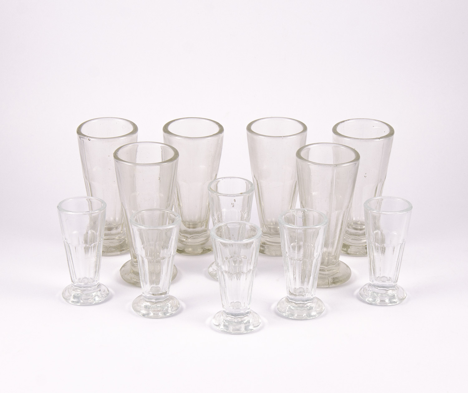 Singular lote formado por una docena de vasos -seis de ellos en cada medida-, utilizados en las antiguas “esquinas”, pulperías y bares del interior de nuestro país. Ejemplares en muy buen estado, salvo uno de los vasos pequeños, con una mínima fisura en su base, restaurada.