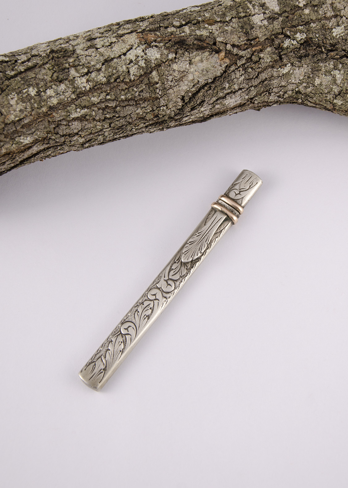 Sorprende el diseño de esta pieza, sin empuñadura, podría decirse… y con una vaina de sección rectangular con su traba; ambas partes decoradas con un anillo liso de media caña combinando metales. Si quitamos esa símil empuñadura y la giramos, ese tramo se introduce en la bocavaina para ensamblarlas y formar el cuchillo. De este modo la vaina se convierte en el cabo. Tanto este como aquella se presentan cincelados con detalles de hojas.