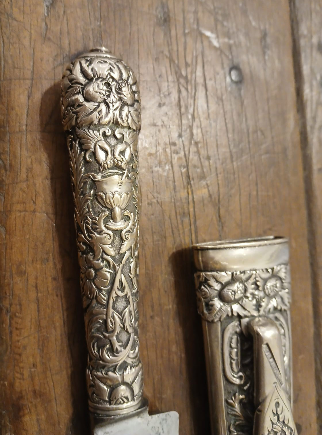 Excepcional cuchillo, decorado en su empuñadura y vaina por las labores de un gran cincelador, quien talló sobre el metal, ramas, hojas, flores y aves en un tupido follaje, un jarrón, y en el centro de la vaina, sobre una reserva tipo pergamino -destinada a grabar las iniciales de su dueño, no utilizada-, un mascarón. En la puntera, una esfera achatada y bruñida como la bocavaina. Punzón en la traba y la bocavaina: A. San Martín Hnos.