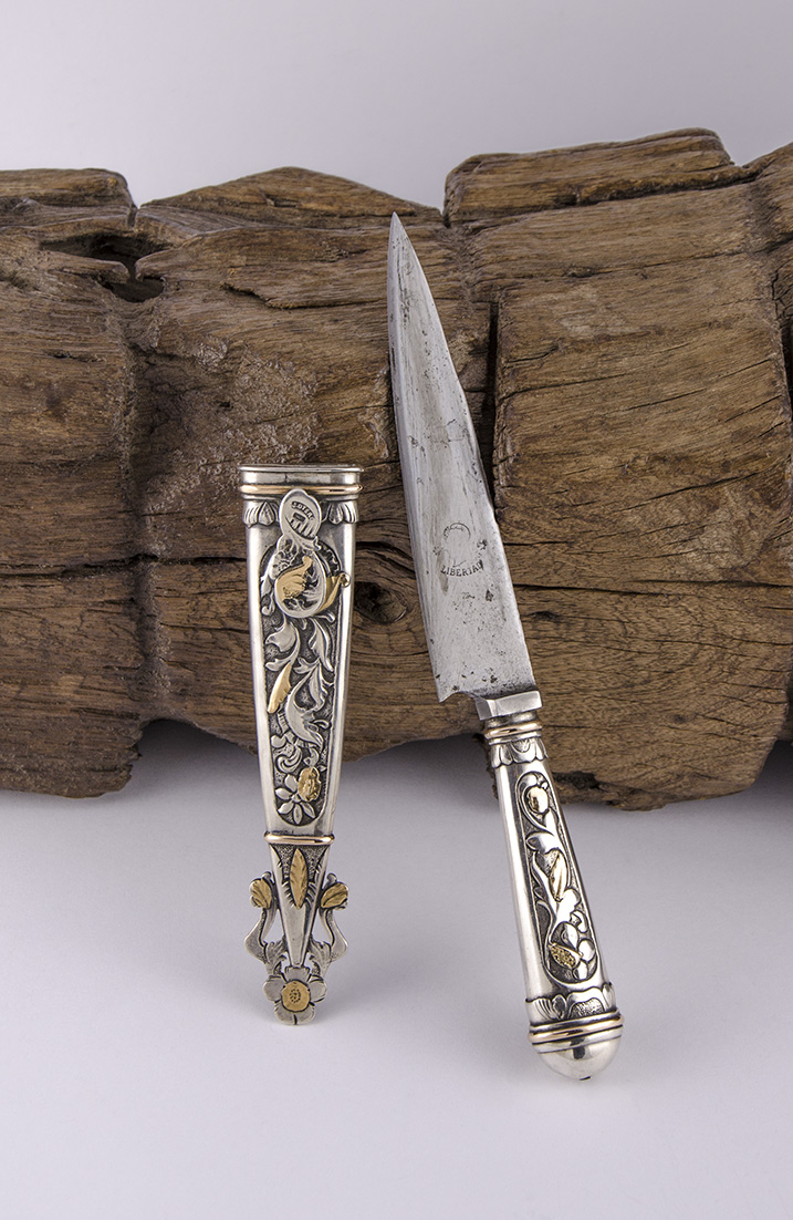 Pieza muy atractiva, de interés incluso por el diseño y la fina ejecución. Tanto en la empuñadura como en la vaina se presentan dos cartelas centrales por lado, en cuyo interior el platero desarrolló una composición de hojas y flores, tema que extendió en la traba y la puntera, y en el margen de los soajes lisos, con un cuidado trabajo de cincelado. Este rasgo más el aporte de aplicaciones caladas y cinceladas combinando metales, hacen de esta pieza un tema de análisis. Dicho en pocas palabras, si no llevara punzón, estaríamos hablando de un estilo porteño puro. Y sin embargo, la autoría sitúa la pieza en la ciudad de Tandil, donde encontramos radicado a J. Otero, en un tiempo asociado a Herrán; aquí en solitario.