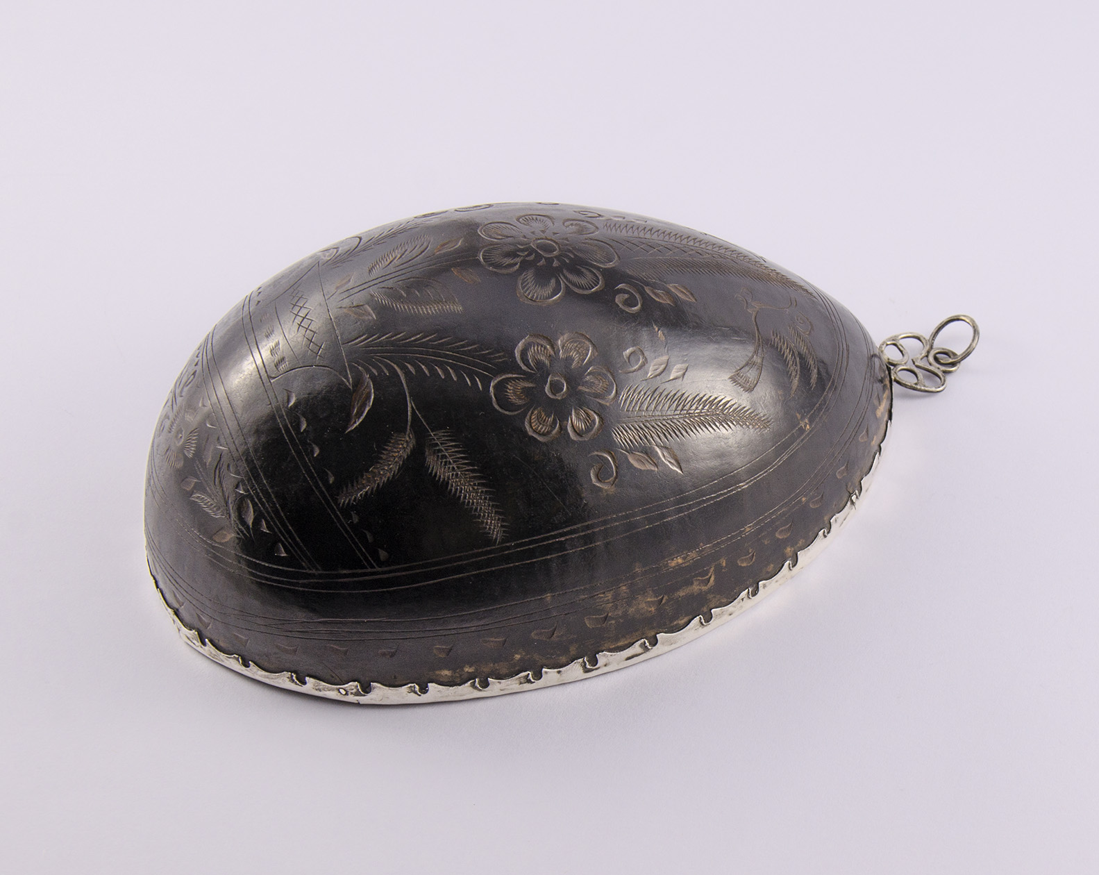 Bruñido y burilado, el cocobolo lleva una guarda perimetral y una compleja prendedura realizada en plata. Como decoración damos con una herencia española: la representación de una maceta con diversas plantas con flores y a lo alto, dos aves en vuelo.