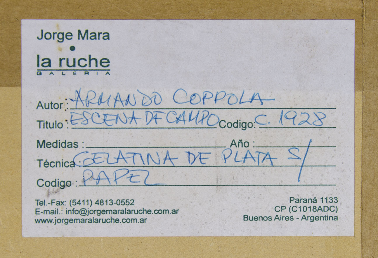 Fotografía en papel a la gelatina de plata, en blanco y negro. Medidas: 35 x 46,5 cm. Conserva detrás la etiqueta / certificado de la galería Jorge Mara - La Ruche, de Buenos Aires, indicando técnica, autoría, título y fecha. Obra en buen estado de conservación, enmarcada. Ex colección Armando Deferrari.