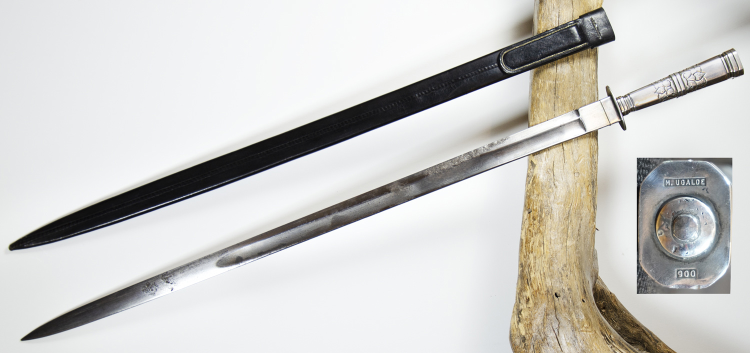 Empuñadura facetada, lisa, con detalles cincelados de hojas y flores, y una pequeña defensa oval, tipo crucero. Con su vaina de suela. En el pomo, los punzones de autoría y de título del metal utilizado: “M. Ugalde” y “900”.