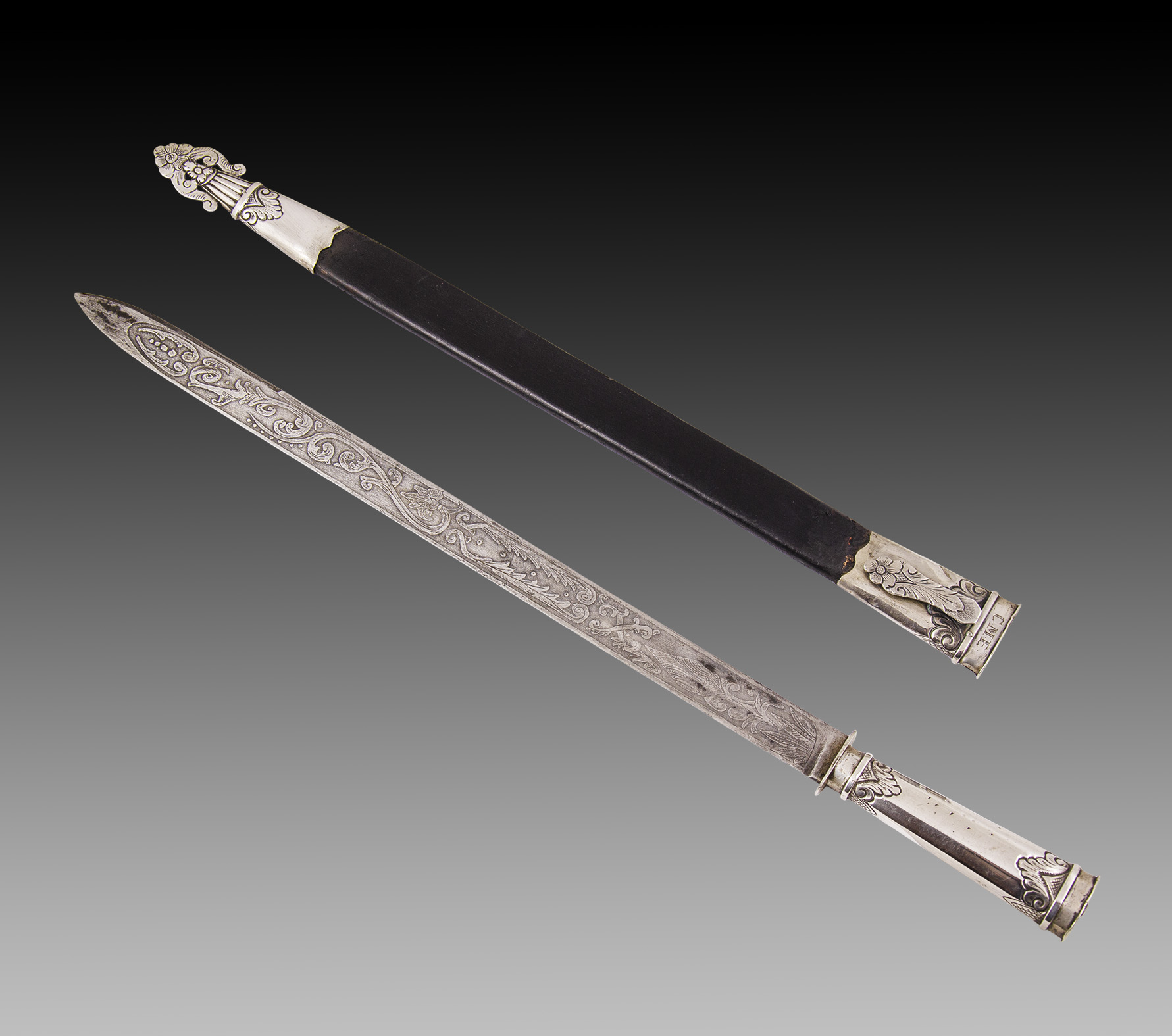 Empuñadura troncocónica de sección oval, lisa, con detalle de hojas cinceladas hacia sus extremos y una pequeña defensa tipo “crucero”, lisa. El diseño del ornato se repite en la puntera y la bocavaina -donde se han grabado las iniciales de su antiguo dueño: “CME”-, con una traba o gancho de pequeñas dimensiones. En la bocavaina presenta tres punzones: INDUSTRIA ARGENTINA / C175 / 800.