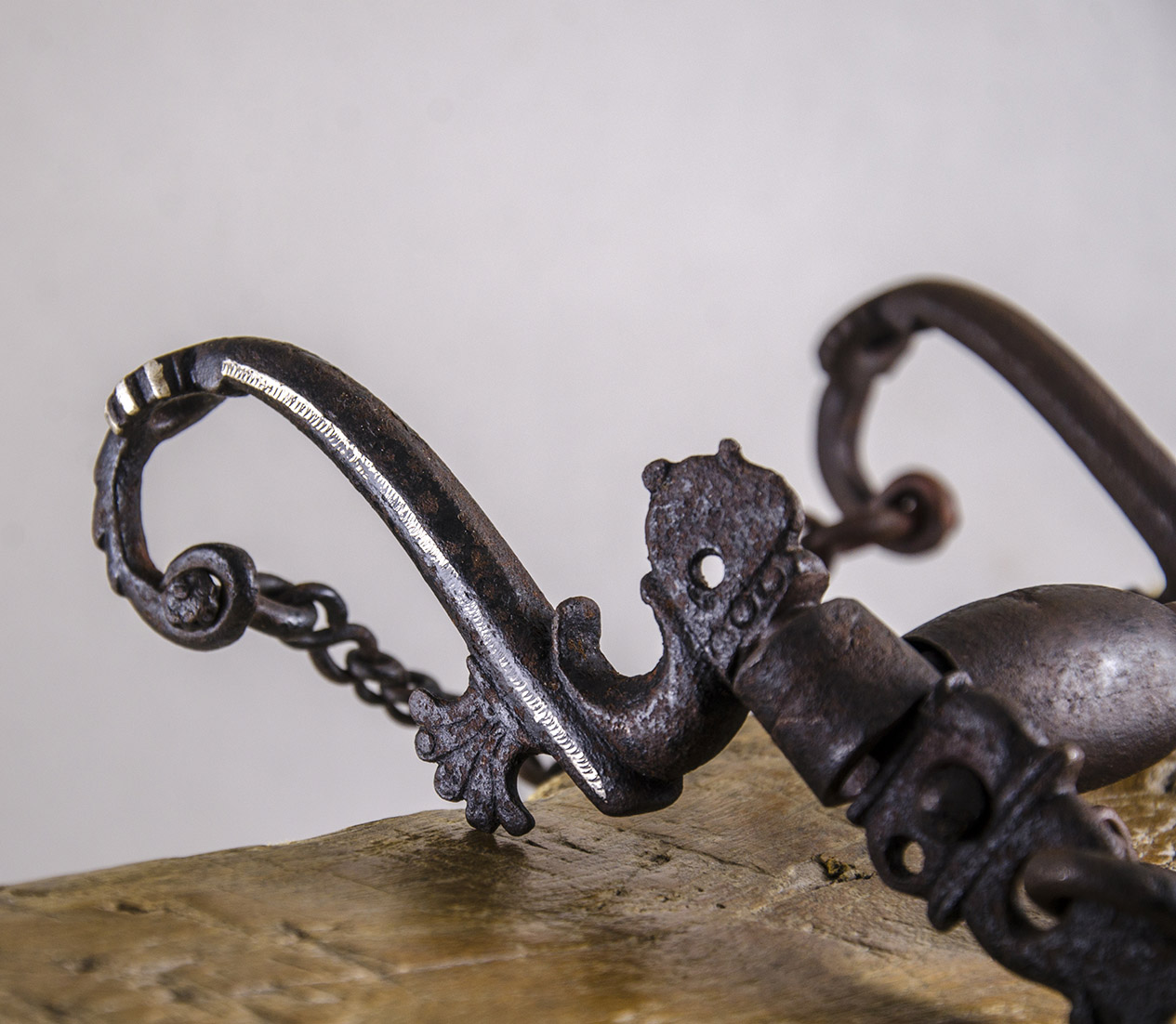 Imponente freno elaborado en un taller de forja. Sus piernas cortas divididas en dos secciones; las superiores o brazos, de forma rectangular, caladas y con detalles de cincel, y las inferiores o piernas, en forma de “S”, con destorcedores para un par de las riendas y un gancho forjado para el otro.