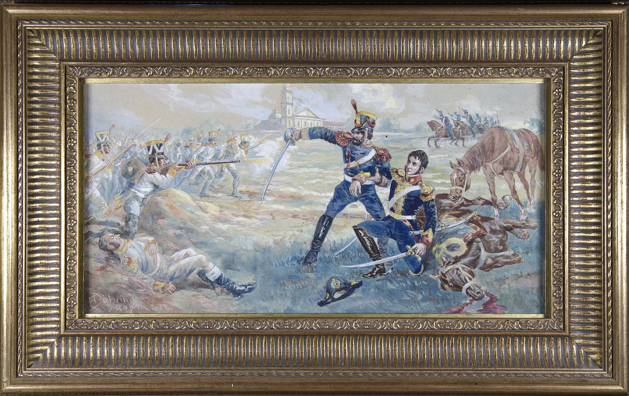 Aún fresca la gran celebración del centenario de la revolución de Mayo de 1910, y con todo el imaginario patriótico argentino en plena ebullición, estas dos escenas pintadas en Roma en 1912, hacen honor al inminente centenario del bautismo de fuego de los gloriosos Granaderos a Caballo en el combate de San Lorenzo. Ambas forman la narración del legendario episodio histórico: el Sargento Juan Bautista Cabral, correntino nativo e hijo de un pardo y una morena -afrodescendientes ellos-, protege a su jefe caído, el capitán José de San Martín. En la primera, San Martín, preso bajo el cuerpo de su caballo muerto, está a punto de ser embestido por un español. A tiempo y desde su caballo el soldado de origen puntano Baigorria le asesta un lanzazo. En la segunda imagen Cabral ya ha levantado a San Martín del suelo, y en la defensa de su jefe antepone el cuerpo en un acto patriótico que le costó la vida. En este mismo combate, que se produjo el 3 de febrero de 1813 en San Lorenzo, provincia de Santa Fe, junto a Cabral fallecieron otros quince Granaderos a Caballo, hombres de tropa y oficiales. Observamos al fondo de ambas pinturas el convento de San Carlos Borromeo.