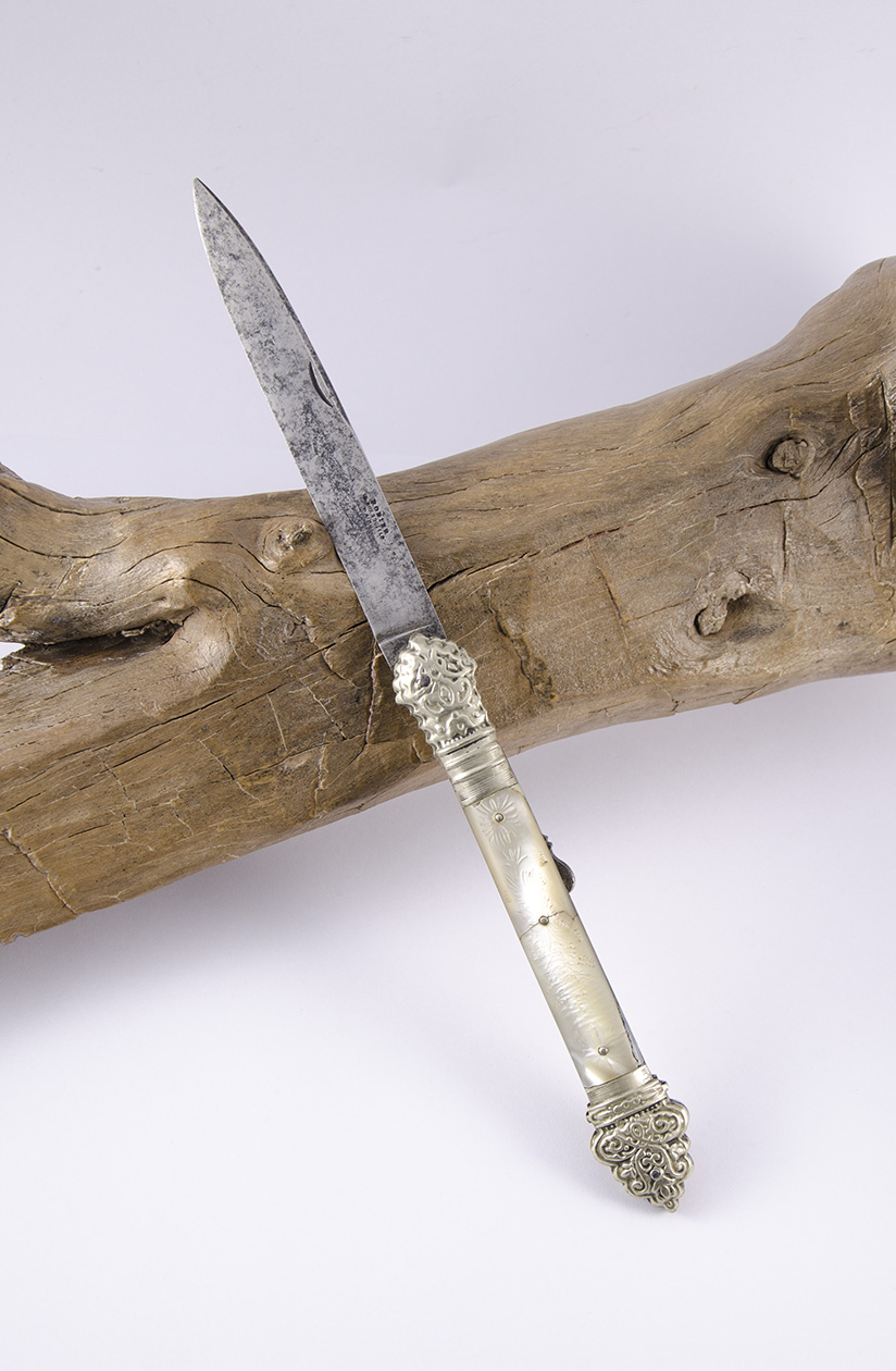 Rara de encontrar debido a su tamaño y a la calidad de su manufactura. La empuñadura se forma con cachas de madreperla (nácar) decoradas con ligeros grabados en los extremos. Presenta punteras de metal blanco estampadas con arabescos. El mecanismo funciona con un robusto muelle, para replegar la hoja a la posición de descanso.