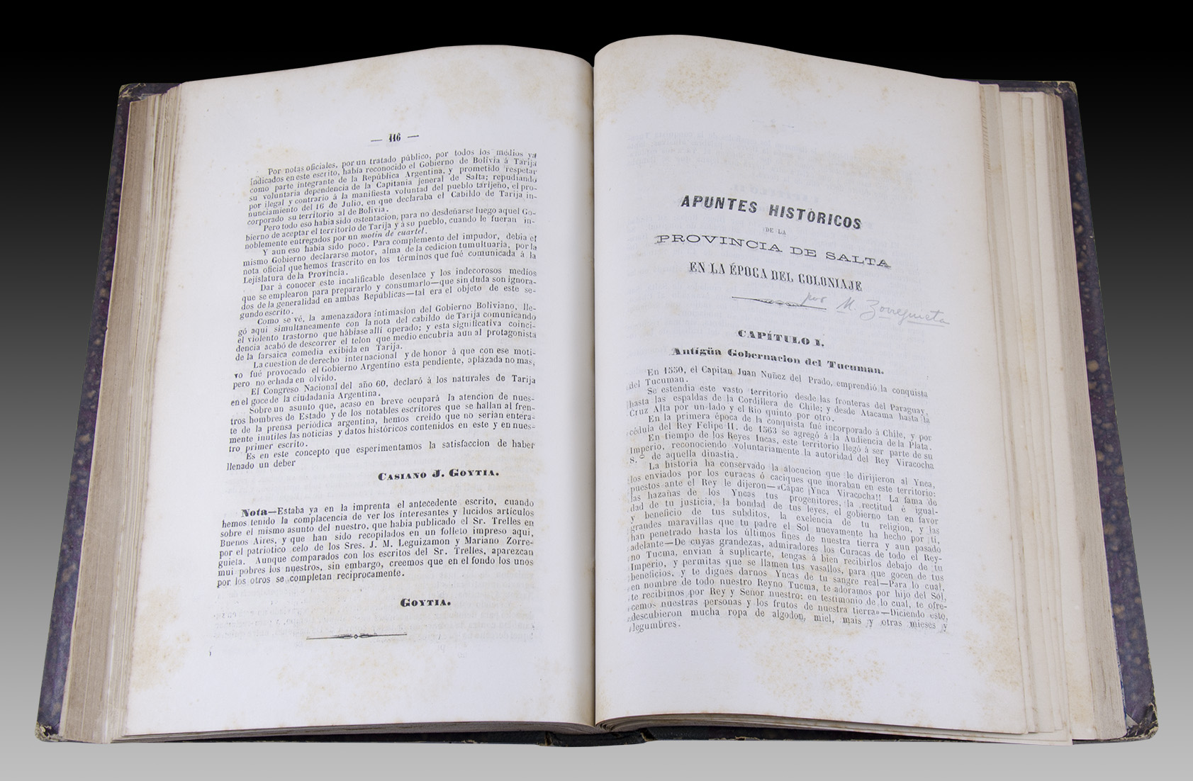 Obras de la mayor importancia para la historiografía del norte argentino, asumidas como propias por los Gobiernos de Tucumán y Salta. Encuadernadas para su distribución oficial a autoridades del país con puntuales detalles de la evolución de las provincias y sus temas limítrofes. El primer título fue pensado para su publicación en el marco de la Exposición Nacional de Córdoba, de 1871, aunque no alcanzó a cumplir con los plazos estipulados. Concluido aquel evento, el gobernador igual ordenó su edición en el afán de alcanzar a los inmigrantes dispuestos a trabajar, invertir y explotar sus producciones -dice el texto- en aquella provincia. Después de un breve recorrido histórico avanza por su fisonomía física, los límites geográficos, la instrucción pública, los caminos, diligencias y correos; sus productos más representativos, como la caña de azúcar, la ganadería y la curtiduría.