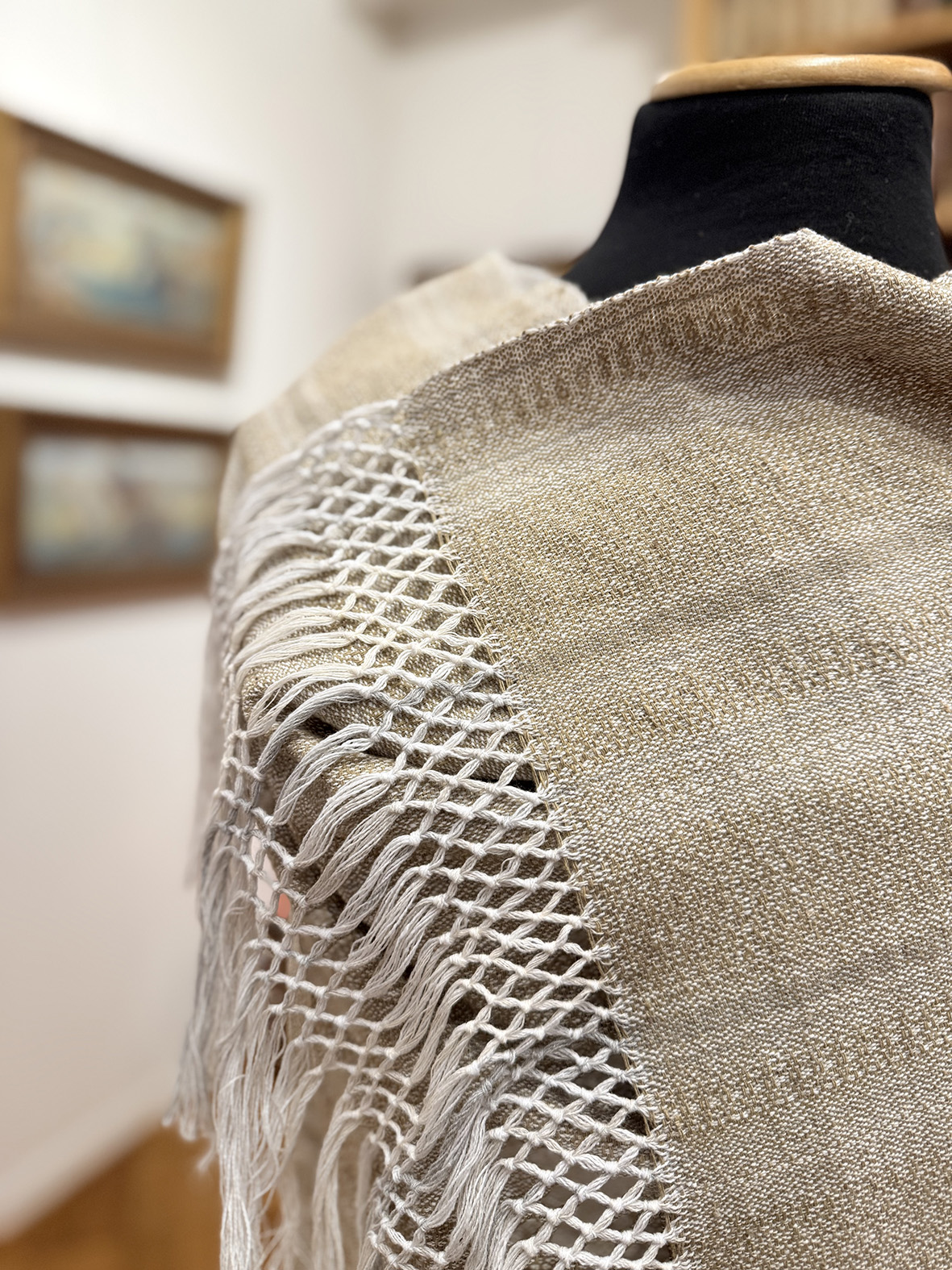 Pieza tejida en telar de cintura con hilado de algodón con rueca rural, por tejedoras de Mitla, Oaxaca, 600 km al sur de la ciudad de México. La técnica utilizada es la de tejido balanceado, que deja a la vista los hilos de urdimbre y trama.