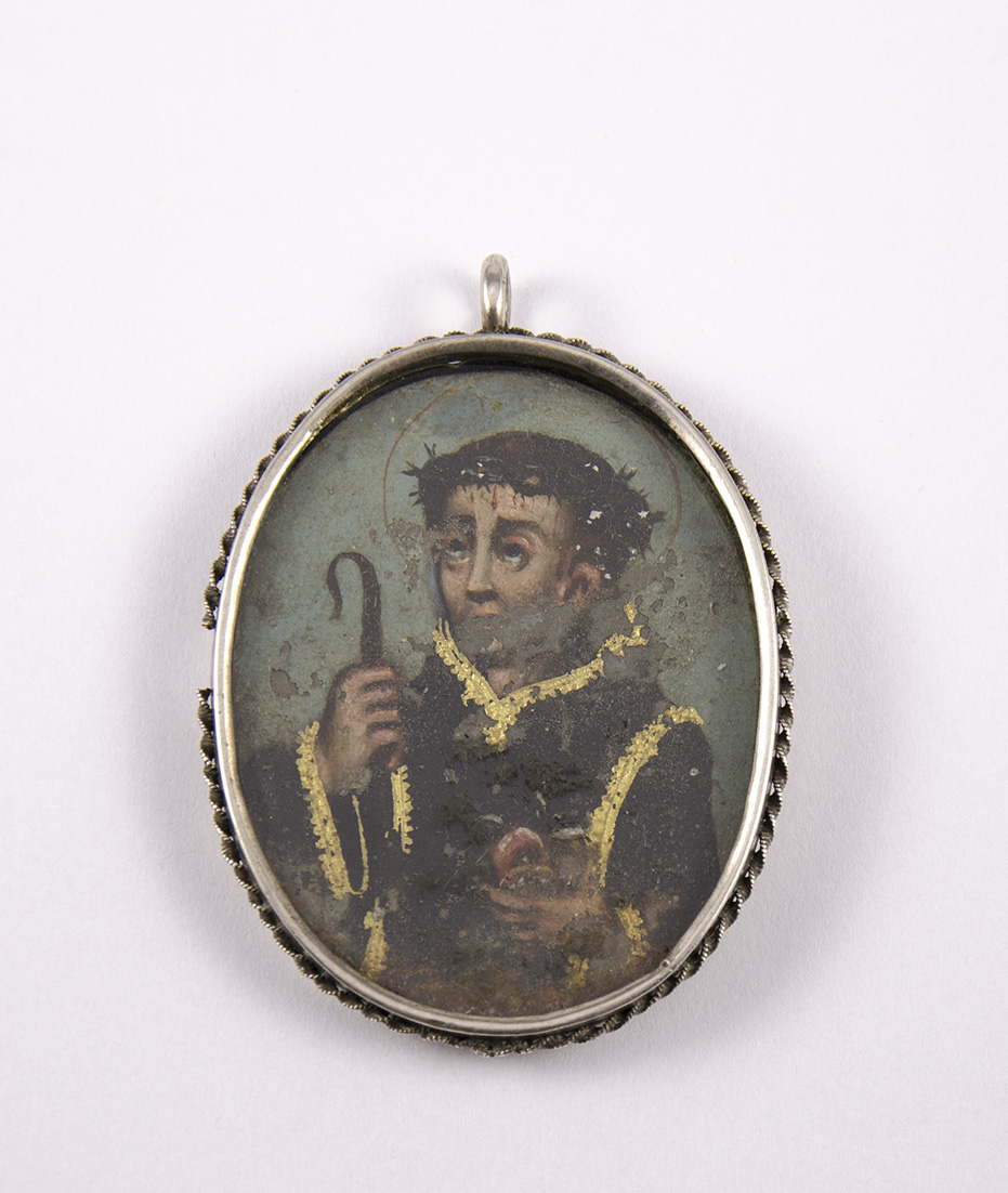Arte popular religioso, óleo sobre metal, presentado en una medalla relicario de tipo oval, con un marco de plata calada y cincelada. En una cara, la representación de la Virgen y el Niño y en el reverso, más deteriorado, San Juan de Dios.