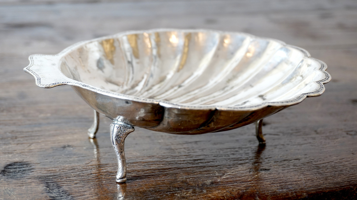 Muy poco frecuente en las colecciones estudiadas. Bandeja republicana en forma de shell o concha marina -formada por ondas que se expanden de modo radial-, también llamada venera, en cuyo perímetro lleva una guarda de pequeños y sucesivos círculos. Apoya sobre tres patas. La obra reúne las técnicas de batido, repujado, cincelado y fundido.