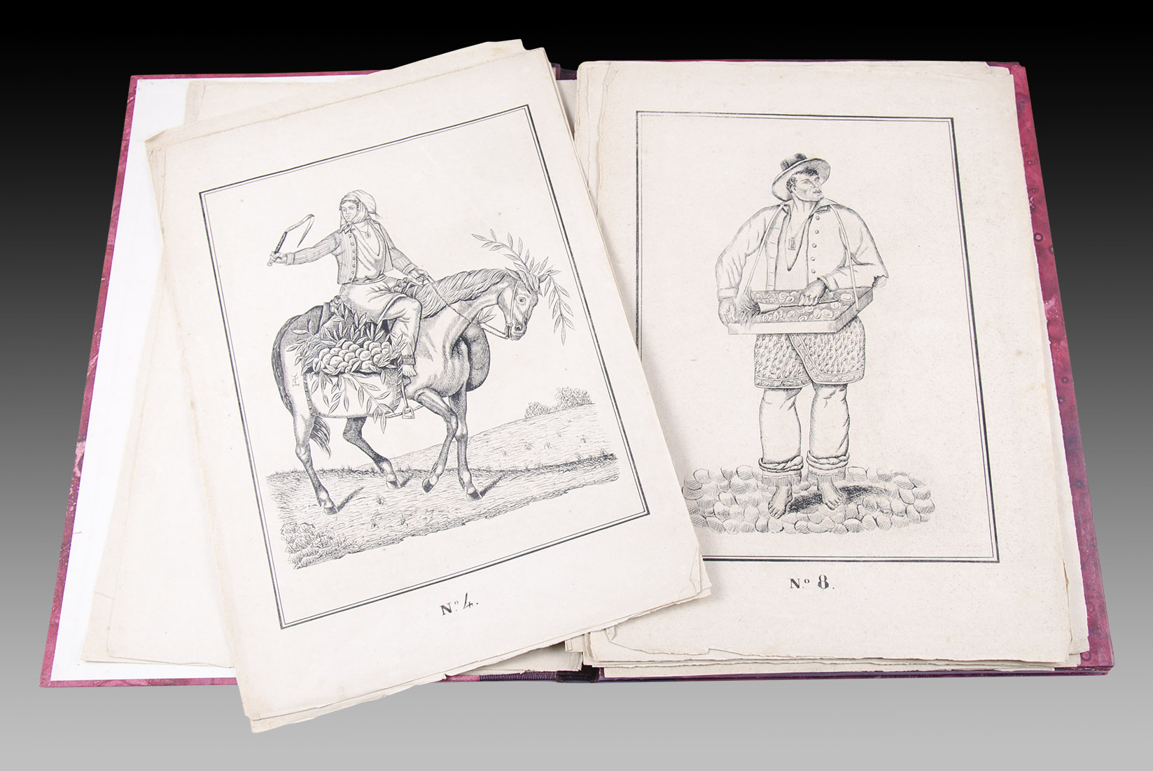Muy hábil en su gestión comercial, Ybarra recreó en esta carpeta las láminas editadas por Bacle en su colección titulada “Trages (sic) y Costumbres de la Provincia de Buenos Aires”, quien, siempre atento a los plagios de sus obras, había fallecido el año anterior.