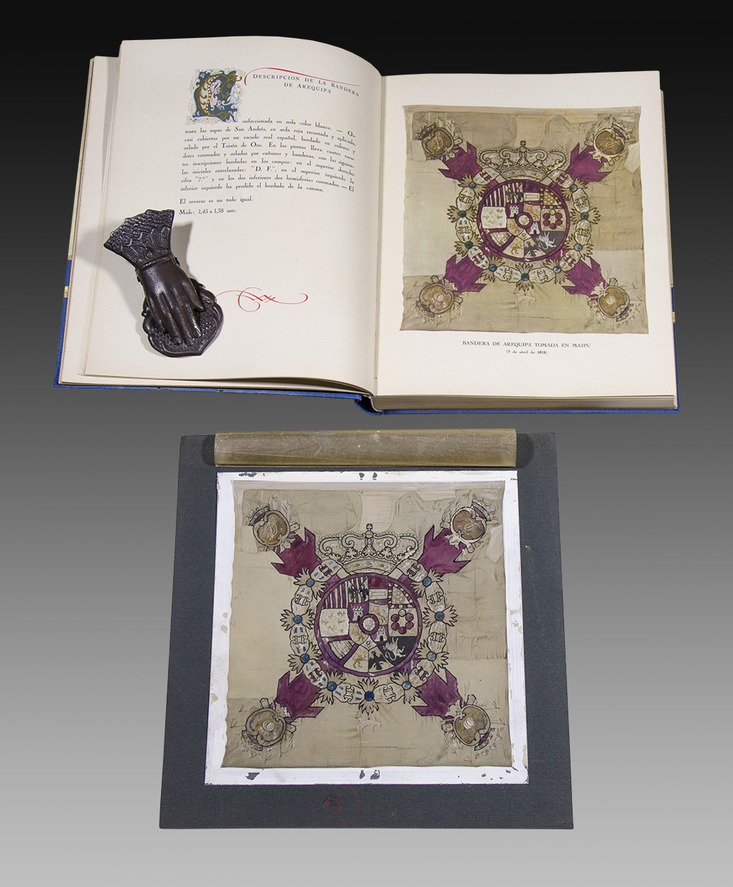 Se trata del proyecto original de un libro que finalmente no vio la luz, con el registro y estudio sobre los trofeos de la Independencia. En el grueso volumen del ejemplar impreso en los talleres de Guillermo Kraft, apenas 13 hojas poseen textos e imágenes, mientras que las restantes 116 vislumbran el tamaño real al que el proyecto aspiraba. Imágenes en colores de gran calidad reproducen banderas y diversos documentos del Batallón de Infantería, de los Voluntarios Provincias de Potosí derrotados en Suipacha y Cotagaita, y abandonados en diciembre de 1810; de la Bandera de Arequipa tomada en Maipú el 5 de abril de 1818; y de la Bandera del Batallón de Granaderos de Reserva traída en 1821 por el General O’Brien. Cada una de las seis imágenes reproducidas en este tramo del libro impreso posee un pormenorizado estudio realizado por Federico Santa Coloma Brandsen, quien fuera director del Museo Histórico Nacional. Completan este conjunto excepcional las 33 fotografías originales de otros trofeos de la Guerra de la Independencia, impresos en gelatina de plata y coloreados a mano, que llevaban el destino de ser reproducidas en este libro.