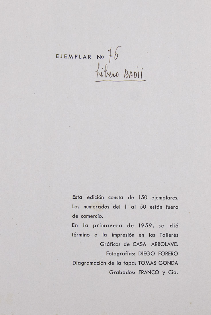 En 4º mayor (29 x 24,5 cm.), 1 h., 1 pliego (4 pp.) con una fotografía y texto manuscrito de Badii reproducidos, 7 láminas de 21 x 16 cm, montadas sobre cartulinas, + 1 h. de colofón. Encuadernación de editor en forma de carpeta, con los pliegos y hojas sueltas en su interior. Obra en buen estado. Ejemplar número 76 de una tirada de 150.
