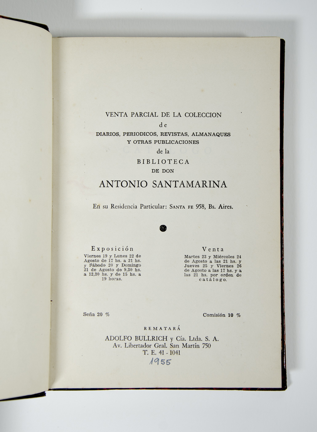 Venta parcial de la Colección de Diarios, Periódicos, Revistas, Almanaques y otras publicaciones de la Biblioteca de Antonio Santamarina.  Buenos Aires. Adolfo Bullrich. 1955.