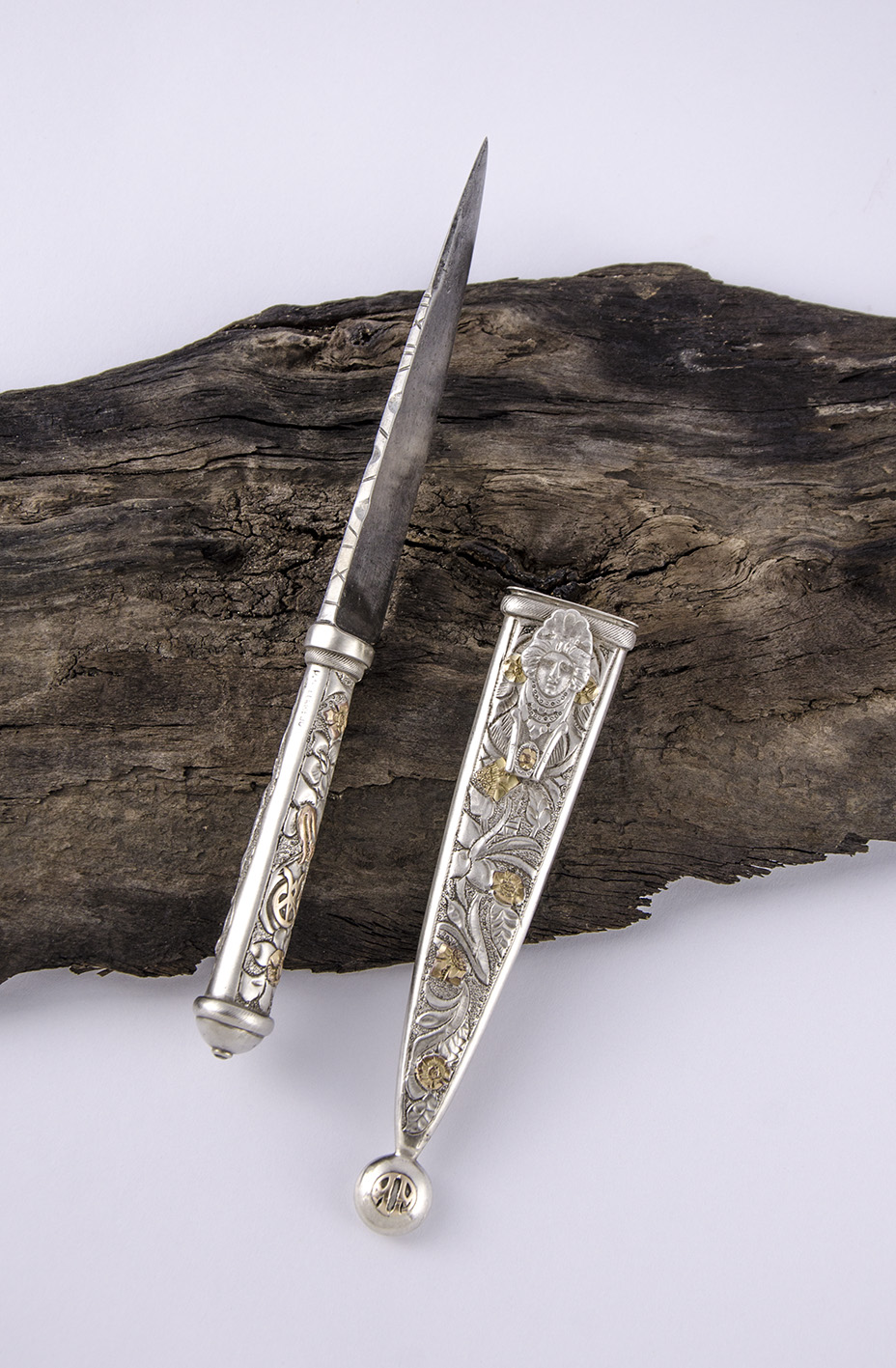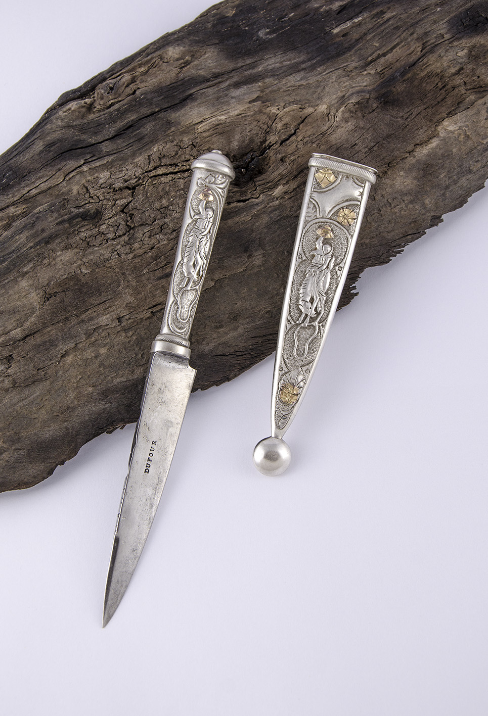 Muy buen logrado cuchillo, con su empuñadura y vaina ricamente cinceladas con motivos florales y aplicaciones de estas últimas en una resuelta combinación de metales preciosos en la cara anterior, y con un jinete domando un potro, en la posterior. En ambas piezas, un soaje galloneado. En la traba, que parece tener un final trunco, muestra una representación mitológica -¿de Medusa?-, y en la puntera, con un diseño singular, las letras aplicadas de su antiguo dueño: AA. Lleva su punzón de autoría:  P. S. LLAMEDO.